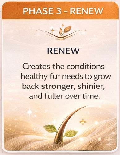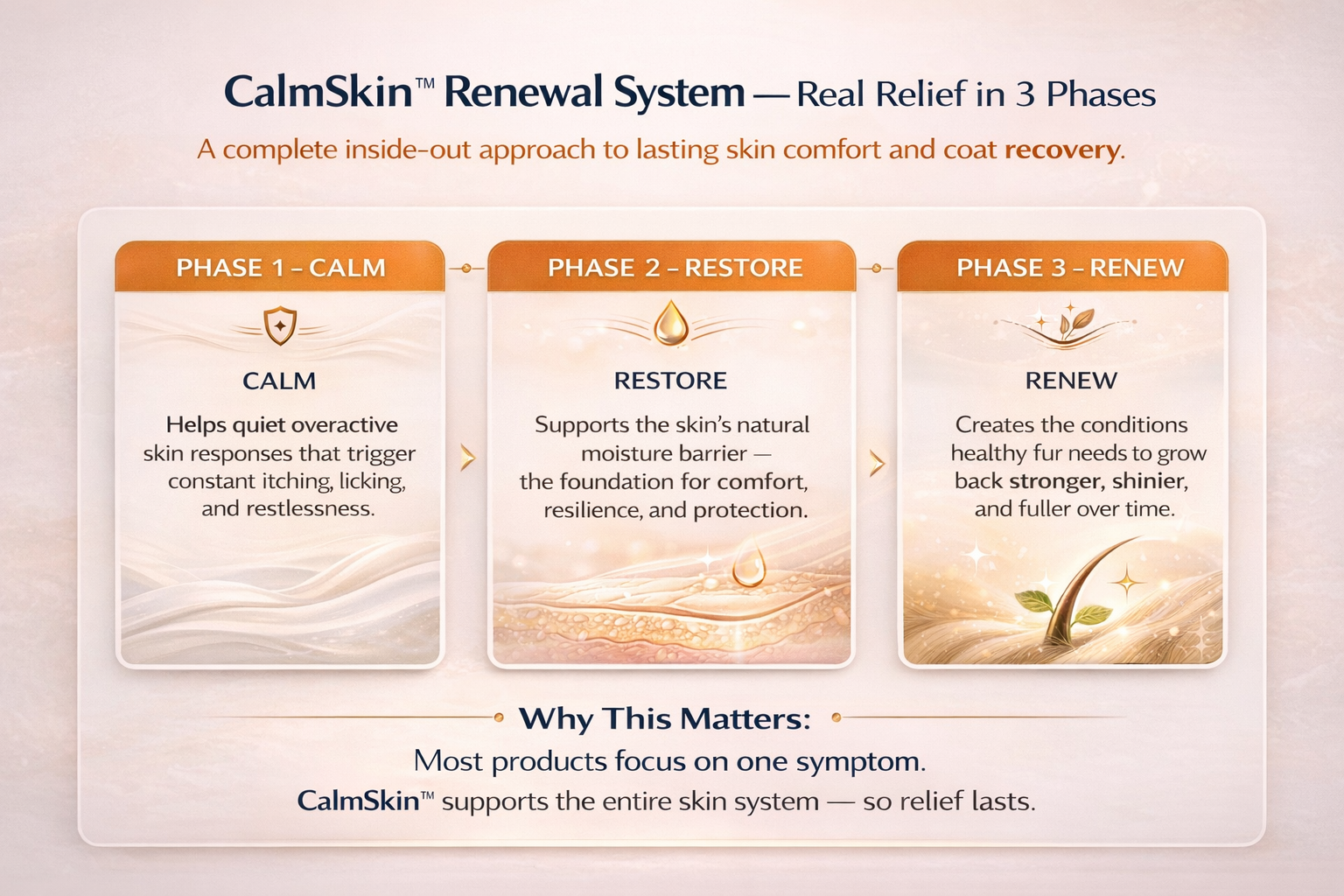A 3-phase, inside-out approach designed to calm irritation, rebuild skin integrity, and support a healthy coat.