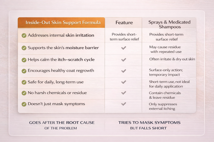 Sprays and shampoos can soothe temporarily — but they can’t restore what the skin needs to stay calm.